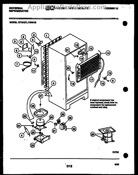 This is a compressor used in several types of home appliances. The compressor is designed to take cold gas in the appliance and place it under pressure so the gas raises in temperature. It is then moved through the refrigerator system to ensure the unit stays cold throughout the appliance. This part can become damaged or malfunction, which may cause the motor to stop running, make the motor noisier, or cause the motor to never stop running.If this happens, the compressor will need to be replaced. A basic set of tools will be needed. A pair of work gloves can also be useful. First, locate the compressor as it may be in various locations depending on the appliance model. Unplug the appliance before removing the compressor. Install the new compressor using the original bolts and nuts before turning the power back on and resuming normal use.This part is sold on an individual basis. The compressor is made to be used with refrigerators, ranges, stoves, ovens, air conditioners, and freezers created by Gibson, Frigidaire, Kelvinator, Montgomery Wards, Westinghouse, Tappan, JCPenney, Universal, and Kenmore. It is an authentic OEM replacement part directly sourced from the manufacturer.