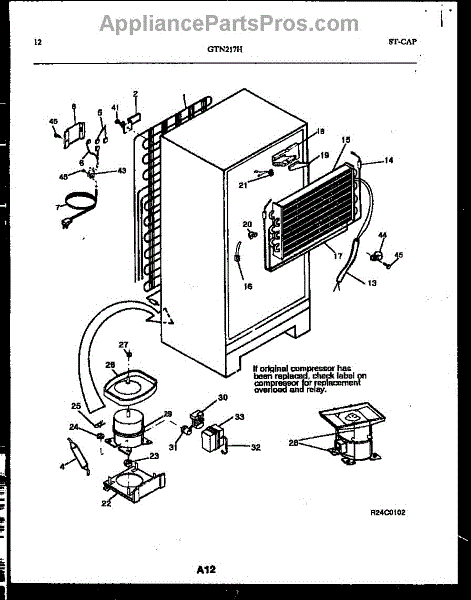 This is a compressor used in several types of home appliances. The compressor is designed to take cold gas in the appliance and place it under pressure so the gas raises in temperature. It is then moved through the refrigerator system to ensure the unit stays cold throughout the appliance. This part can become damaged or malfunction, which may cause the motor to stop running, make the motor noisier, or cause the motor to never stop running.If this happens, the compressor will need to be replaced. A basic set of tools will be needed. A pair of work gloves can also be useful. First, locate the compressor as it may be in various locations depending on the appliance model. Unplug the appliance before removing the compressor. Install the new compressor using the original bolts and nuts before turning the power back on and resuming normal use.This part is sold on an individual basis. The compressor is made to be used with refrigerators, ranges, stoves, ovens, air conditioners, and freezers created by Gibson, Frigidaire, Kelvinator, Montgomery Wards, Westinghouse, Tappan, JCPenney, Universal, and Kenmore. It is an authentic OEM replacement part directly sourced from the manufacturer.