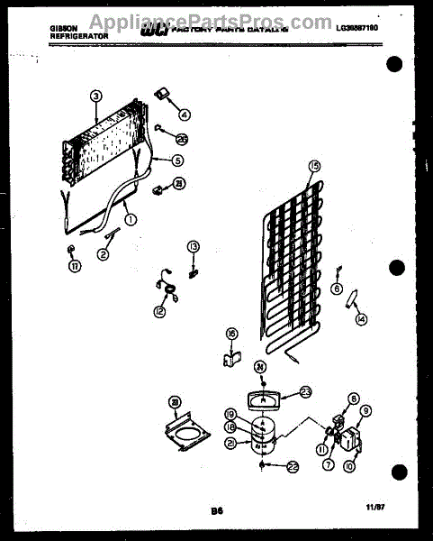 This is a compressor used in several types of home appliances. The compressor is designed to take cold gas in the appliance and place it under pressure so the gas raises in temperature. It is then moved through the refrigerator system to ensure the unit stays cold throughout the appliance. This part can become damaged or malfunction, which may cause the motor to stop running, make the motor noisier, or cause the motor to never stop running.If this happens, the compressor will need to be replaced. A basic set of tools will be needed. A pair of work gloves can also be useful. First, locate the compressor as it may be in various locations depending on the appliance model. Unplug the appliance before removing the compressor. Install the new compressor using the original bolts and nuts before turning the power back on and resuming normal use.This part is sold on an individual basis. The compressor is made to be used with refrigerators, ranges, stoves, ovens, air conditioners, and freezers created by Gibson, Frigidaire, Kelvinator, Montgomery Wards, Westinghouse, Tappan, JCPenney, Universal, and Kenmore. It is an authentic OEM replacement part directly sourced from the manufacturer.