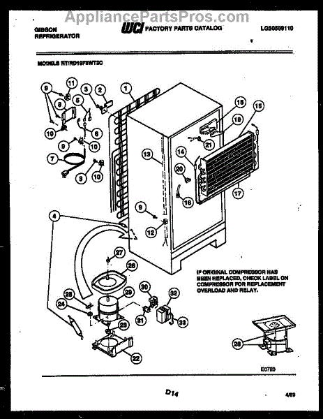 This is a compressor used in several types of home appliances. The compressor is designed to take cold gas in the appliance and place it under pressure so the gas raises in temperature. It is then moved through the refrigerator system to ensure the unit stays cold throughout the appliance. This part can become damaged or malfunction, which may cause the motor to stop running, make the motor noisier, or cause the motor to never stop running.If this happens, the compressor will need to be replaced. A basic set of tools will be needed. A pair of work gloves can also be useful. First, locate the compressor as it may be in various locations depending on the appliance model. Unplug the appliance before removing the compressor. Install the new compressor using the original bolts and nuts before turning the power back on and resuming normal use.This part is sold on an individual basis. The compressor is made to be used with refrigerators, ranges, stoves, ovens, air conditioners, and freezers created by Gibson, Frigidaire, Kelvinator, Montgomery Wards, Westinghouse, Tappan, JCPenney, Universal, and Kenmore. It is an authentic OEM replacement part directly sourced from the manufacturer.