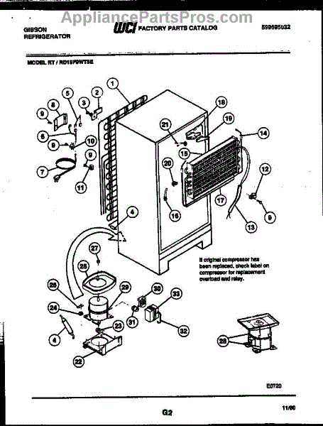 This is a compressor used in several types of home appliances. The compressor is designed to take cold gas in the appliance and place it under pressure so the gas raises in temperature. It is then moved through the refrigerator system to ensure the unit stays cold throughout the appliance. This part can become damaged or malfunction, which may cause the motor to stop running, make the motor noisier, or cause the motor to never stop running.If this happens, the compressor will need to be replaced. A basic set of tools will be needed. A pair of work gloves can also be useful. First, locate the compressor as it may be in various locations depending on the appliance model. Unplug the appliance before removing the compressor. Install the new compressor using the original bolts and nuts before turning the power back on and resuming normal use.This part is sold on an individual basis. The compressor is made to be used with refrigerators, ranges, stoves, ovens, air conditioners, and freezers created by Gibson, Frigidaire, Kelvinator, Montgomery Wards, Westinghouse, Tappan, JCPenney, Universal, and Kenmore. It is an authentic OEM replacement part directly sourced from the manufacturer.