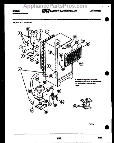This is a compressor used in several types of home appliances. The compressor is designed to take cold gas in the appliance and place it under pressure so the gas raises in temperature. It is then moved through the refrigerator system to ensure the unit stays cold throughout the appliance. This part can become damaged or malfunction, which may cause the motor to stop running, make the motor noisier, or cause the motor to never stop running.If this happens, the compressor will need to be replaced. A basic set of tools will be needed. A pair of work gloves can also be useful. First, locate the compressor as it may be in various locations depending on the appliance model. Unplug the appliance before removing the compressor. Install the new compressor using the original bolts and nuts before turning the power back on and resuming normal use.This part is sold on an individual basis. The compressor is made to be used with refrigerators, ranges, stoves, ovens, air conditioners, and freezers created by Gibson, Frigidaire, Kelvinator, Montgomery Wards, Westinghouse, Tappan, JCPenney, Universal, and Kenmore. It is an authentic OEM replacement part directly sourced from the manufacturer.