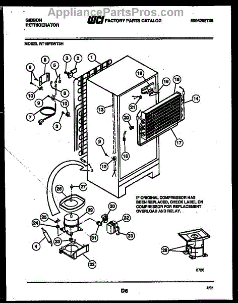This is a compressor used in several types of home appliances. The compressor is designed to take cold gas in the appliance and place it under pressure so the gas raises in temperature. It is then moved through the refrigerator system to ensure the unit stays cold throughout the appliance. This part can become damaged or malfunction, which may cause the motor to stop running, make the motor noisier, or cause the motor to never stop running.If this happens, the compressor will need to be replaced. A basic set of tools will be needed. A pair of work gloves can also be useful. First, locate the compressor as it may be in various locations depending on the appliance model. Unplug the appliance before removing the compressor. Install the new compressor using the original bolts and nuts before turning the power back on and resuming normal use.This part is sold on an individual basis. The compressor is made to be used with refrigerators, ranges, stoves, ovens, air conditioners, and freezers created by Gibson, Frigidaire, Kelvinator, Montgomery Wards, Westinghouse, Tappan, JCPenney, Universal, and Kenmore. It is an authentic OEM replacement part directly sourced from the manufacturer.