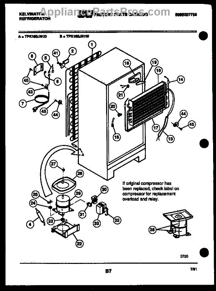 This is a compressor used in several types of home appliances. The compressor is designed to take cold gas in the appliance and place it under pressure so the gas raises in temperature. It is then moved through the refrigerator system to ensure the unit stays cold throughout the appliance. This part can become damaged or malfunction, which may cause the motor to stop running, make the motor noisier, or cause the motor to never stop running.If this happens, the compressor will need to be replaced. A basic set of tools will be needed. A pair of work gloves can also be useful. First, locate the compressor as it may be in various locations depending on the appliance model. Unplug the appliance before removing the compressor. Install the new compressor using the original bolts and nuts before turning the power back on and resuming normal use.This part is sold on an individual basis. The compressor is made to be used with refrigerators, ranges, stoves, ovens, air conditioners, and freezers created by Gibson, Frigidaire, Kelvinator, Montgomery Wards, Westinghouse, Tappan, JCPenney, Universal, and Kenmore. It is an authentic OEM replacement part directly sourced from the manufacturer.