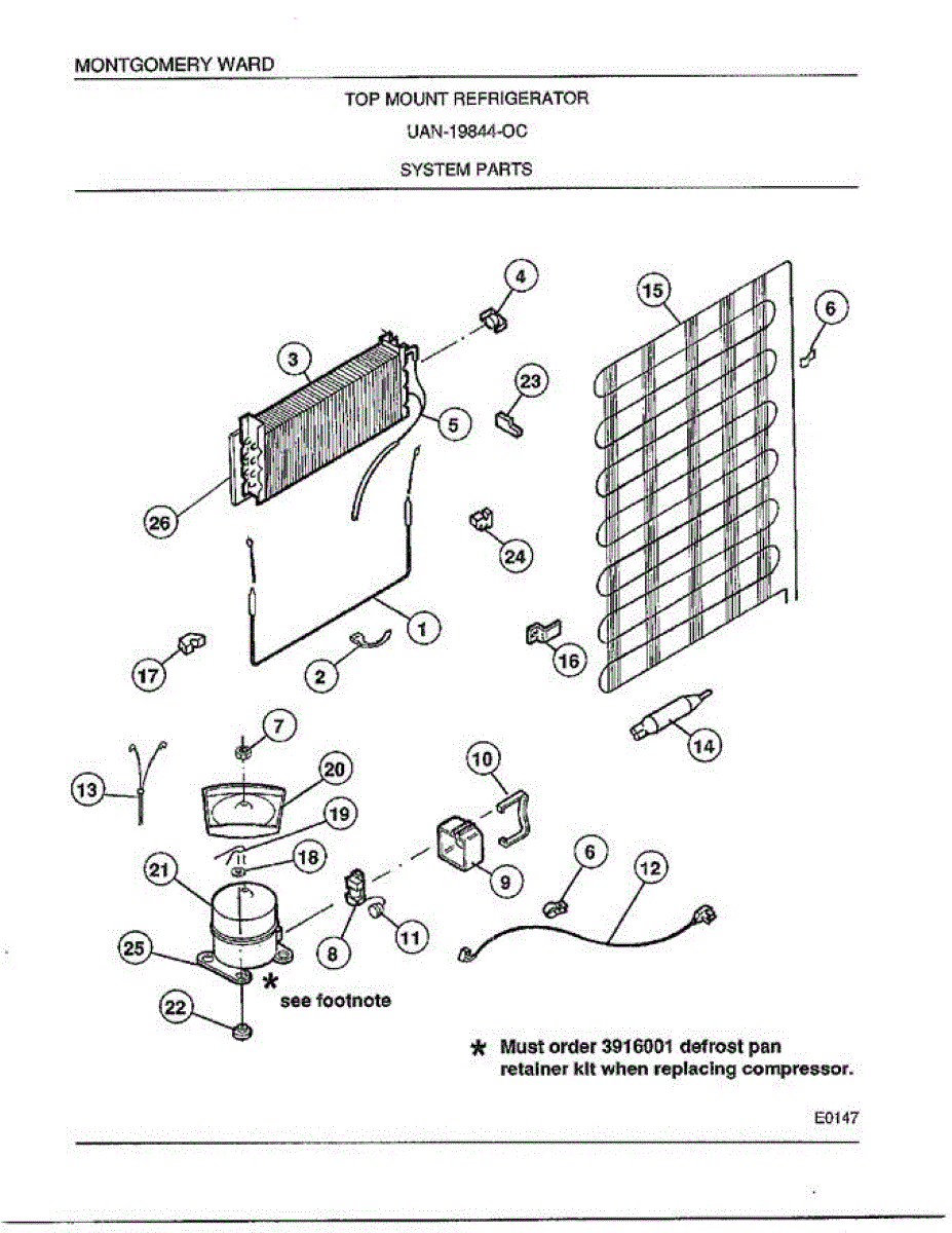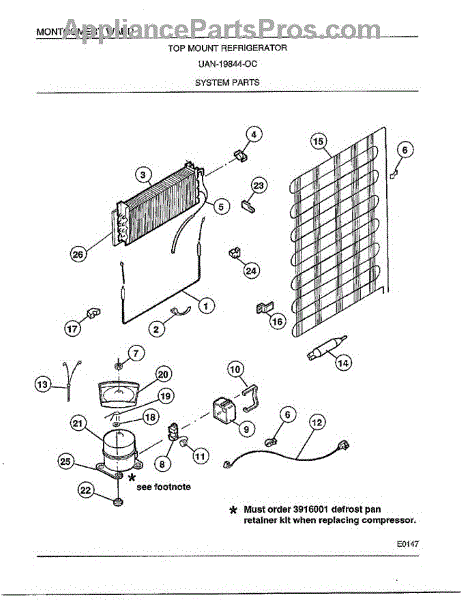 This is a compressor used in several types of home appliances. The compressor is designed to take cold gas in the appliance and place it under pressure so the gas raises in temperature. It is then moved through the refrigerator system to ensure the unit stays cold throughout the appliance. This part can become damaged or malfunction, which may cause the motor to stop running, make the motor noisier, or cause the motor to never stop running.If this happens, the compressor will need to be replaced. A basic set of tools will be needed. A pair of work gloves can also be useful. First, locate the compressor as it may be in various locations depending on the appliance model. Unplug the appliance before removing the compressor. Install the new compressor using the original bolts and nuts before turning the power back on and resuming normal use.This part is sold on an individual basis. The compressor is made to be used with refrigerators, ranges, stoves, ovens, air conditioners, and freezers created by Gibson, Frigidaire, Kelvinator, Montgomery Wards, Westinghouse, Tappan, JCPenney, Universal, and Kenmore. It is an authentic OEM replacement part directly sourced from the manufacturer.