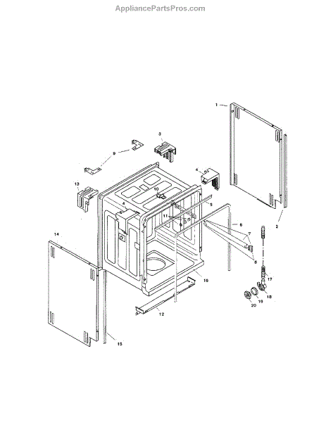 Causes of faulty dishrack stops include wear of sliding surfaces through repetitive racking and unracking over extended use. Exposure to moisture in the wash chamber environment can accelerate degradation.