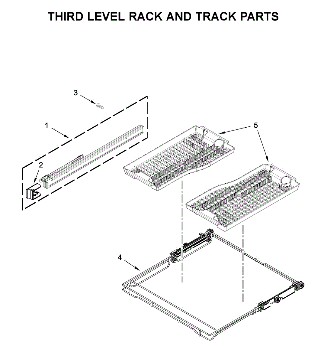 Right-side track for dishwasher third-level rack. Mounts to interior cabinet wall and allows rack to glide smoothly. Replace if cracked, broken, or worn.