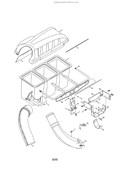 This upper chute assembly is part of a riding lawnmower bagging system. As the grass is mowed, it is pulled up and through the upper chute, where it is deposited in the grass bag. This is an OEM replacement part sourced directly from the manufacturer. If the upper chute has become damaged due to age or exposure to the elements, this part should be installed to repair the lawnmower.If the upper chute is damaged, grass clippings may not be fully bagged. Cracks in the chute can reduce efficiency, and some of the clippings may remain on the ground or eventually clog the tube. If the bag doesn't appear to be catching clippings after mowing, the upper chute assembly should be inspected. To repair the upper chute assembly, remove the machine's bagger and locate the damaged upper chute. Remove the damaged upper chute and dispose of it. Install the new upper chute and replace the mower bag. This upper chute assembly is a black plastic molded part that is sold individually. It is designed for use on lawnmowers manufactured by MTD and Craftsman.