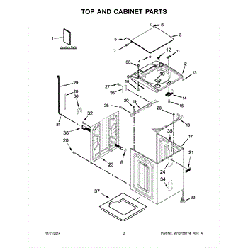 The Top is an OEM part for Whirlpool washing machines. It forms the outer top shell of the washer, providing structure and housing for internal components. The top protects suspension rods, drive motor, controls and other parts while maintaining an attractive aesthetic appearance. It is constructed from durable materials designed to withstand the mechanical stresses of the wash cycle.