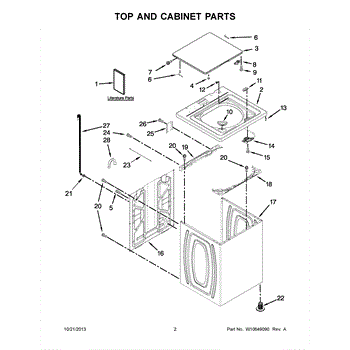 Top cover lid for your washer that provides access to the drum for loading and unloading laundry. Replace if cracked, broken, or damaged beyond repair.