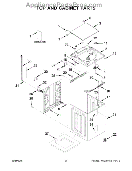 The Top is an OEM part for Whirlpool washing machines. It forms the outer top shell of the washer, providing structure and housing for internal components. The top protects suspension rods, drive motor, controls and other parts while maintaining an attractive aesthetic appearance. It is constructed from durable materials designed to withstand the mechanical stresses of the wash cycle.