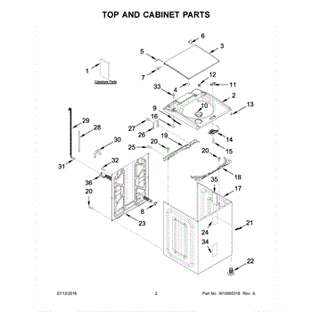 The Top is an OEM part for Whirlpool washing machines. It forms the outer top shell of the washer, providing structure and housing for internal components. The top protects suspension rods, drive motor, controls and other parts while maintaining an attractive aesthetic appearance. It is constructed from durable materials designed to withstand the mechanical stresses of the wash cycle.