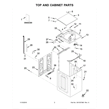 The Top is an OEM part for Whirlpool washing machines. It forms the outer top shell of the washer, providing structure and housing for internal components. The top protects suspension rods, drive motor, controls and other parts while maintaining an attractive aesthetic appearance. It is constructed from durable materials designed to withstand the mechanical stresses of the wash cycle.