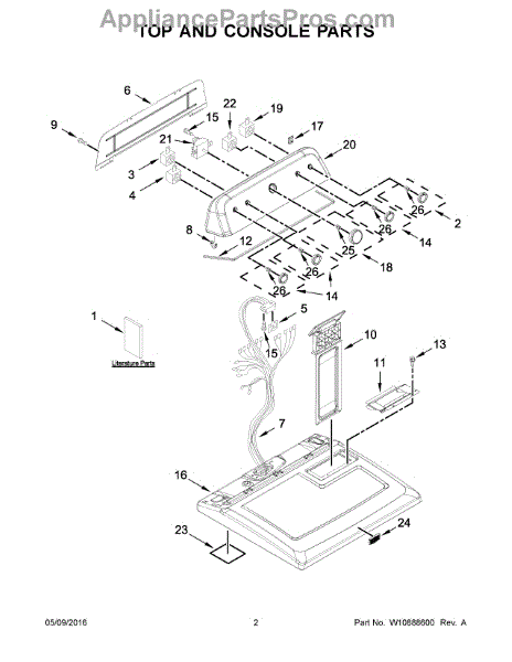 The Console Clip is an OEM part compatible with Whirlpool dryers. This clip secures the control console assembly to the top panel, ensuring it is firmly mounted during operation. Properly functioning clips are necessary to maintain the correct alignment of controls and prevent detachment.
