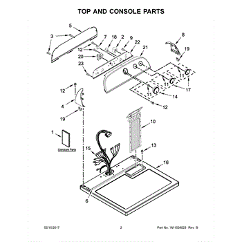 The Console Clip is an OEM part compatible with Whirlpool dryers. This clip secures the control console assembly to the top panel, ensuring it is firmly mounted during operation. Properly functioning clips are necessary to maintain the correct alignment of controls and prevent detachment.