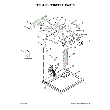 The Console Clip is an OEM part compatible with Whirlpool dryers. This clip secures the control console assembly to the top panel, ensuring it is firmly mounted during operation. Properly functioning clips are necessary to maintain the correct alignment of controls and prevent detachment.