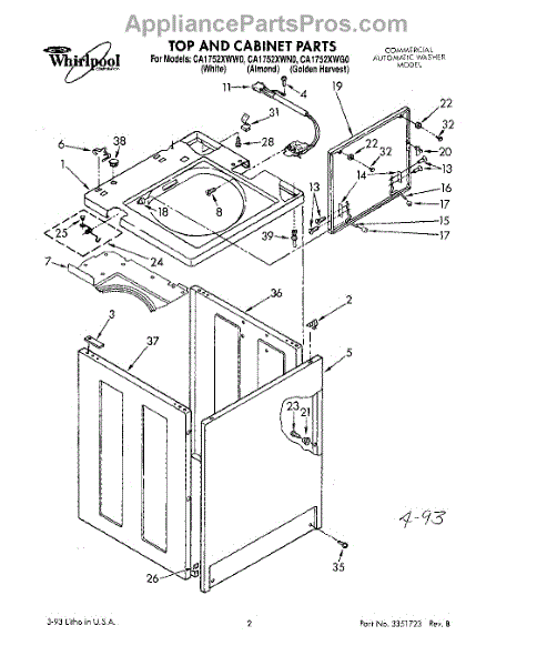 The Washer Lid Screw is an OEM part for Whirlpool washing machines. This 6-32 x .340 screw secures the washer lid to the hinge assembly, ensuring the lid opens and closes smoothly and stays securely in place during operation.