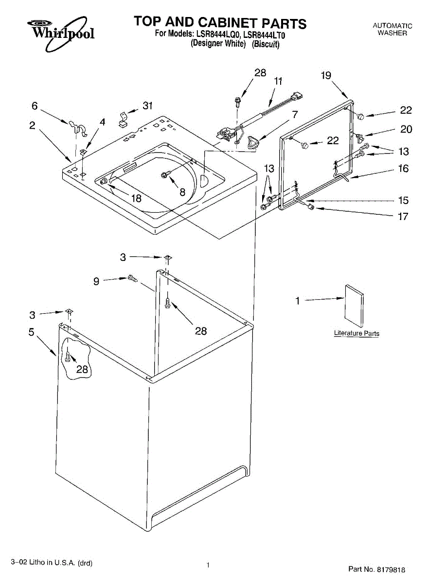 Repair manual for top loading automatic direct drive washing machines made by Whirlpool. Covered brands include Whirlpool, Sears, Kenmore, Kitchen Aid, Roper, and Estate. Easy to follow photographs and step-by-step repair procedures.