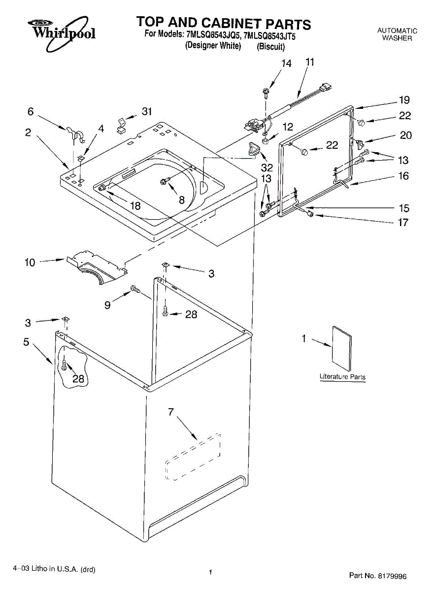 The Washer Lid Screw is an OEM part for Whirlpool washing machines. This 6-32 x .340 screw secures the washer lid to the hinge assembly, ensuring the lid opens and closes smoothly and stays securely in place during operation.