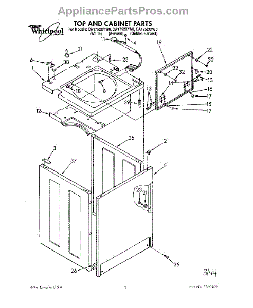 Parts for Whirlpool CA1752XYN0: 01 - Top And Cabinet, Lit / Optional Parts