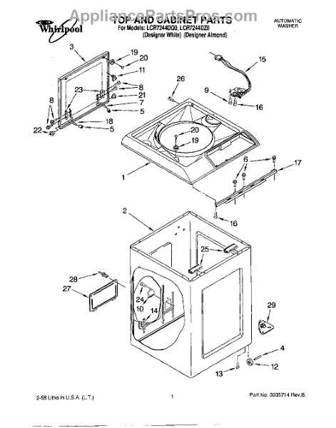 The Washer Lid Screw is an OEM part for Whirlpool washing machines. This 6-32 x .340 screw secures the washer lid to the hinge assembly, ensuring the lid opens and closes smoothly and stays securely in place during operation.