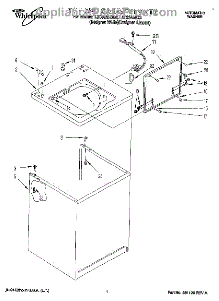 Repair manual for top loading automatic direct drive washing machines made by Whirlpool. Covered brands include Whirlpool, Sears, Kenmore, Kitchen Aid, Roper, and Estate. Easy to follow photographs and step-by-step repair procedures.