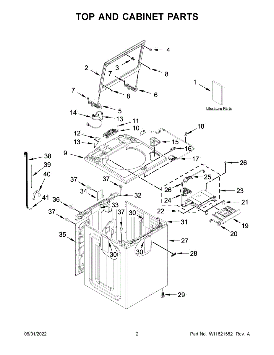 Replacement lid for top-load washers. Covers and secures the drum during operation. Replace if cracked, broken, won't stay closed, or damaged from wear.
