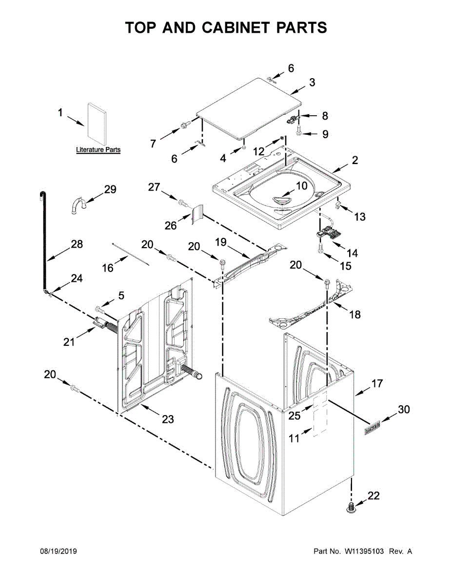 This replacement top is the outer cabinet top panel that restores the dryer's finished appearance and provides a stable surface above the drum. It replaces damaged, dented or rusted tops to improve looks and protect internal components. What it does