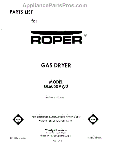 Parts for Roper GL6050VW0: 01 - Top And Console , Literature And Op Parts