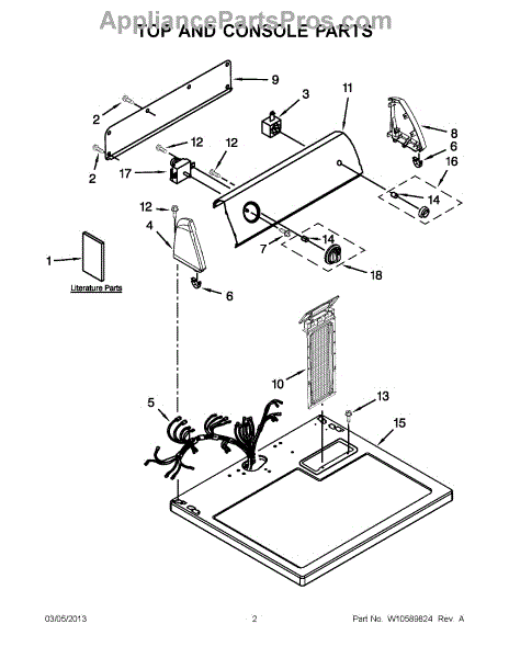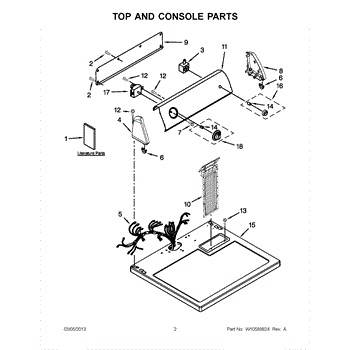The Console Clip is an OEM part compatible with Whirlpool dryers. This clip secures the control console assembly to the top panel, ensuring it is firmly mounted during operation. Properly functioning clips are necessary to maintain the correct alignment of controls and prevent detachment.
