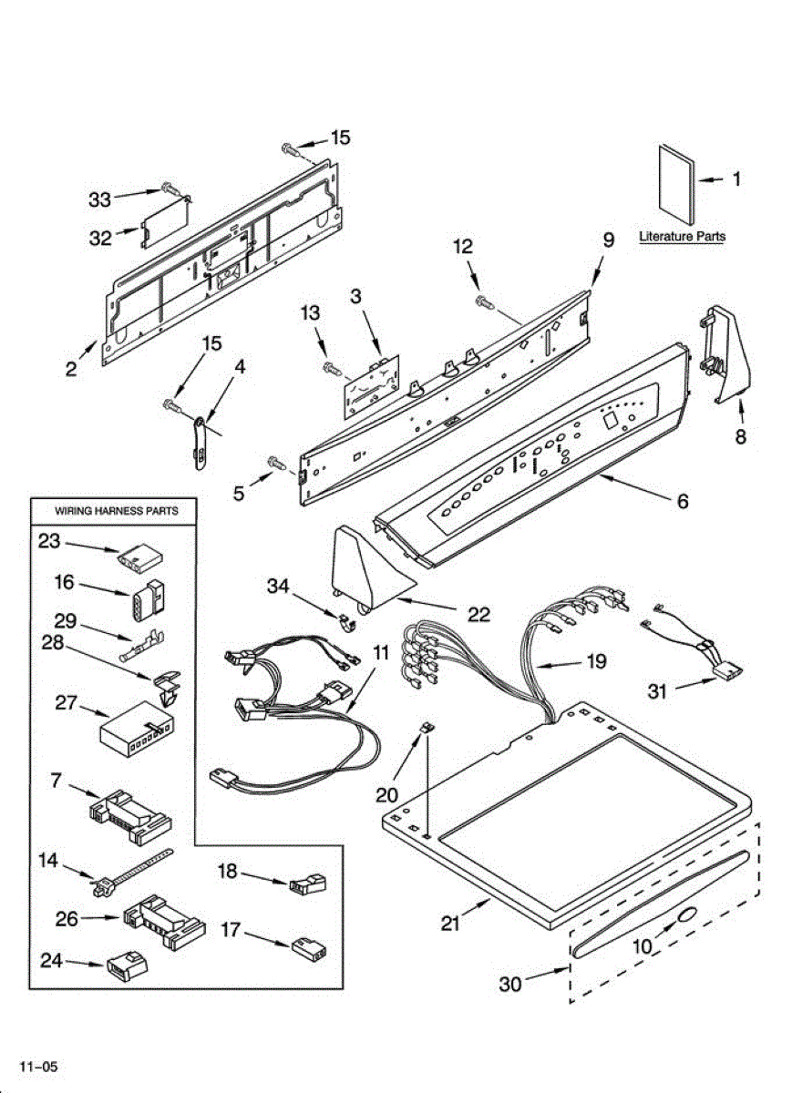 5-circuit wire harness connector for dryers. Connects wiring harness to control board. Replace if cracked, damaged, or pins are bent or corroded.