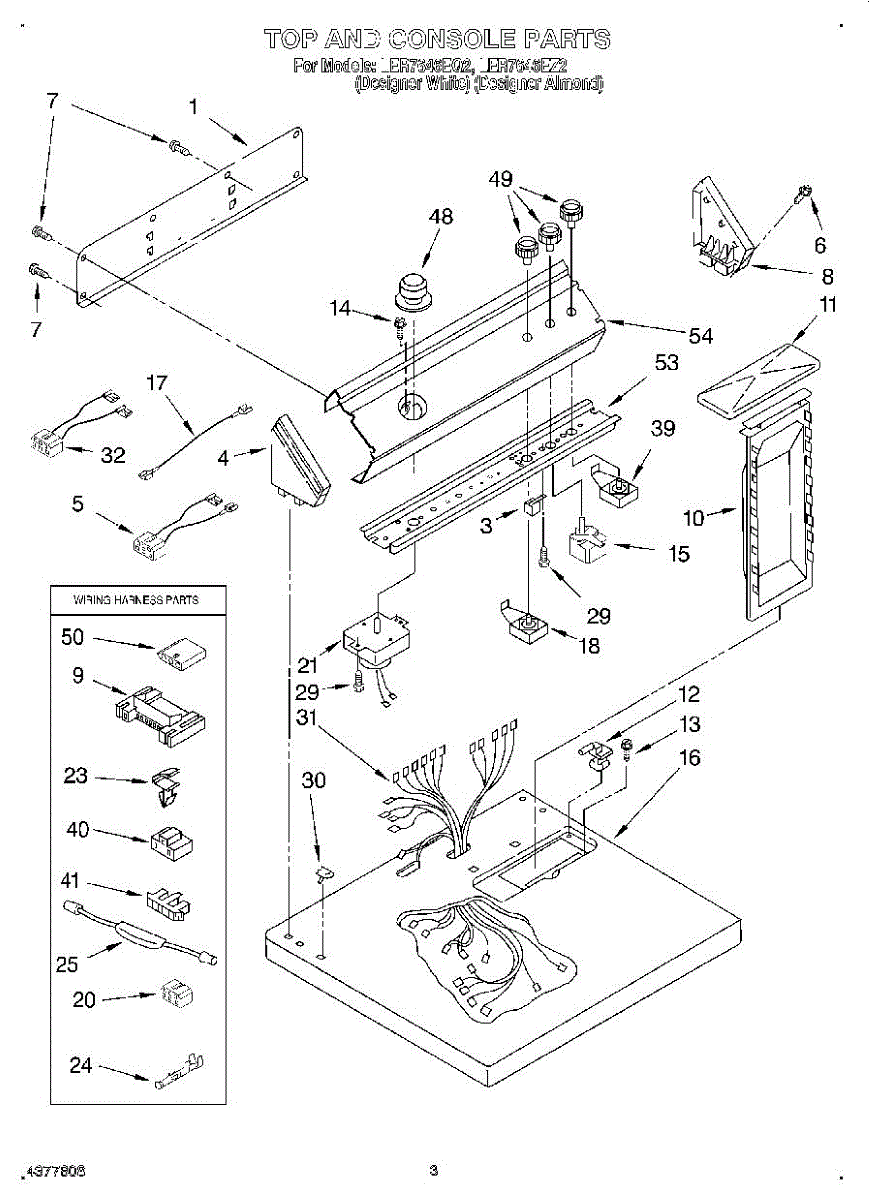 Wire harness assembly that routes power and control signals between dryer components. Replace if wires are damaged, worn, broken, or connections are loose.