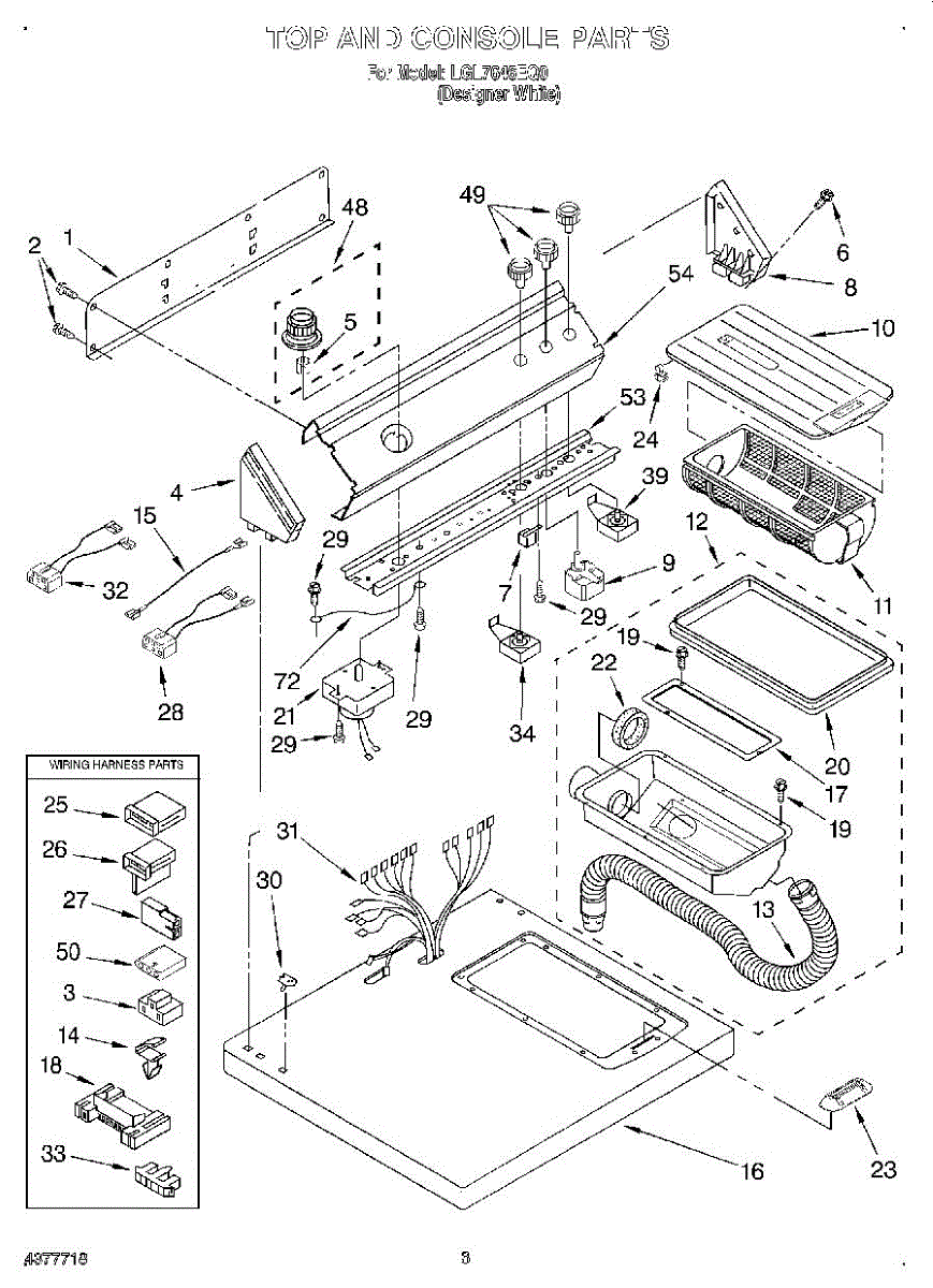 Wire harness assembly that routes power and control signals between dryer components. Replace if wires are damaged, worn, broken, or connections are loose.