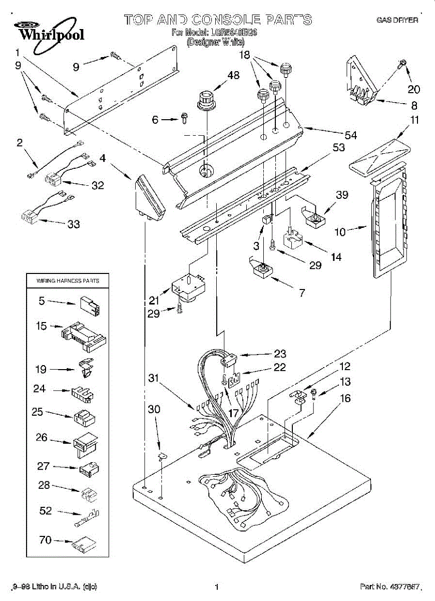 Wire harness assembly that routes power and control signals between dryer components. Replace if wires are damaged, worn, broken, or connections are loose.