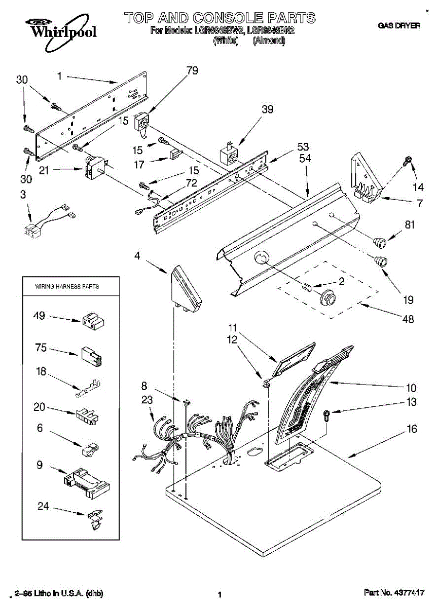 Wire harness assembly that routes power and control signals between dryer components. Replace if wires are damaged, worn, broken, or connections are loose.