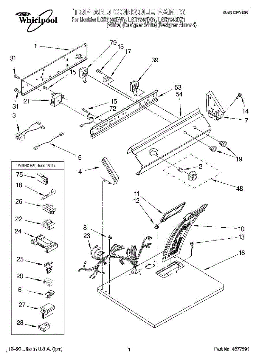 Wire harness assembly that routes power and control signals between dryer components. Replace if wires are damaged, worn, broken, or connections are loose.