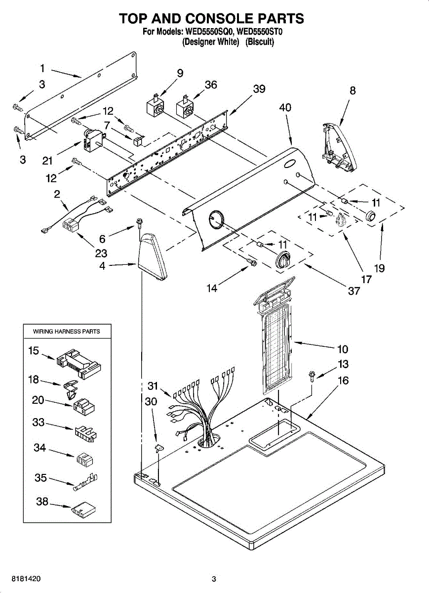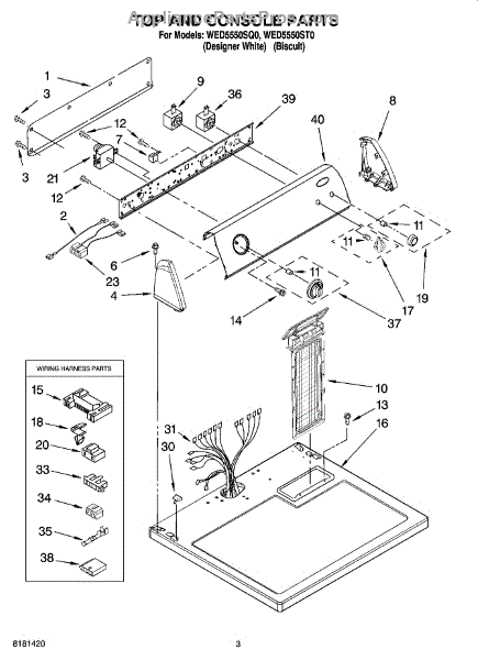Wire harness assembly that routes power and control signals between dryer components. Replace if wires are damaged, worn, broken, or connections are loose.