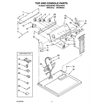 The Console Clip is an OEM part compatible with Whirlpool dryers. This clip secures the control console assembly to the top panel, ensuring it is firmly mounted during operation. Properly functioning clips are necessary to maintain the correct alignment of controls and prevent detachment.