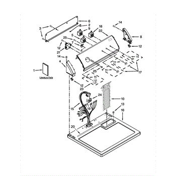 The Console Clip is an OEM part compatible with Whirlpool dryers. This clip secures the control console assembly to the top panel, ensuring it is firmly mounted during operation. Properly functioning clips are necessary to maintain the correct alignment of controls and prevent detachment.