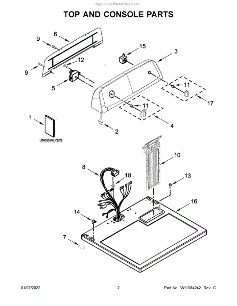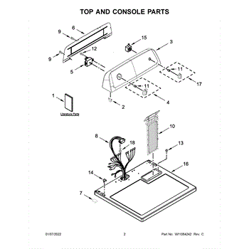 The Console Clip is an OEM part compatible with Whirlpool dryers. This clip secures the control console assembly to the top panel, ensuring it is firmly mounted during operation. Properly functioning clips are necessary to maintain the correct alignment of controls and prevent detachment.