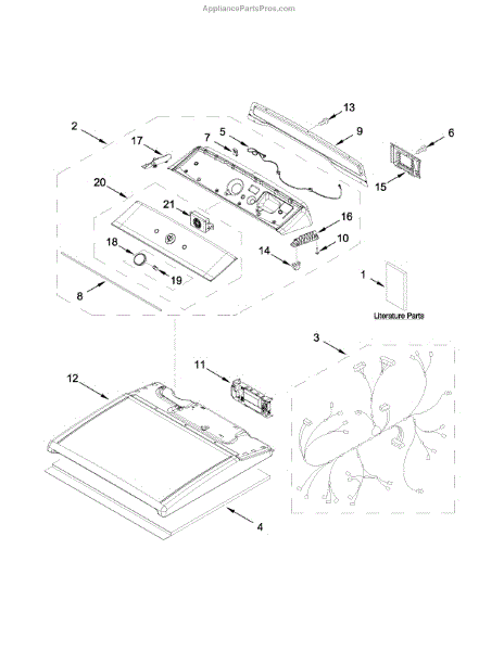 The Top is an OEM replacement part for Whirlpool dryers. It serves as the protective cover for the top of the dryer, keeping dust and debris out while providing a finished look. It is designed to withstand the demands of daily use and provides a sturdy surface for placing items on top of the dryer.
