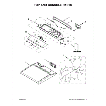 The Top is an OEM replacement part for Whirlpool dryers. It serves as the protective cover for the top of the dryer, keeping dust and debris out while providing a finished look. It is designed to withstand the demands of daily use and provides a sturdy surface for placing items on top of the dryer.