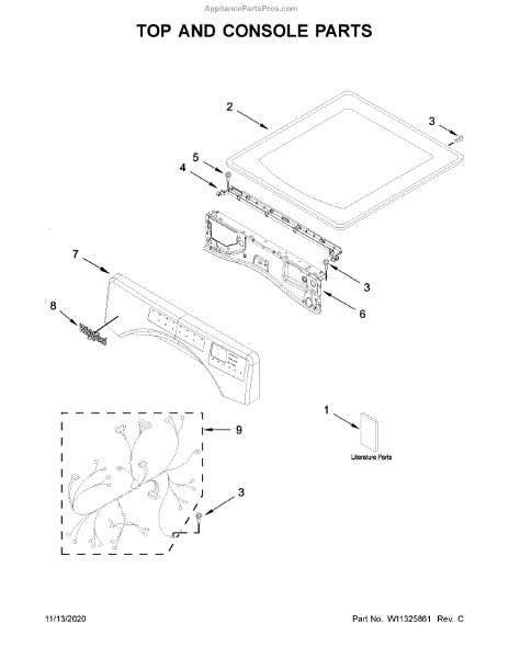 This replacement console restores the user interface and housing that holds the control buttons and display, letting you operate dryer or washer functions safely and reliably. Fits into the machine's front upper area. What it does: