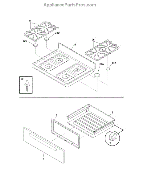 Parts for Crosley CRG3480GWWB: Top / Drawer Parts