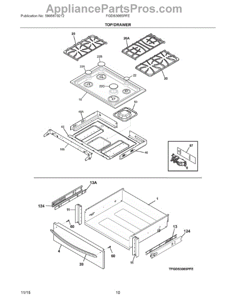 This main top assembly replaces the cooktop surface to restore a flat, secure mounting area for burners and controls. It helps improve appearance and prevents food and spills from entering the cabinet below. What it does: