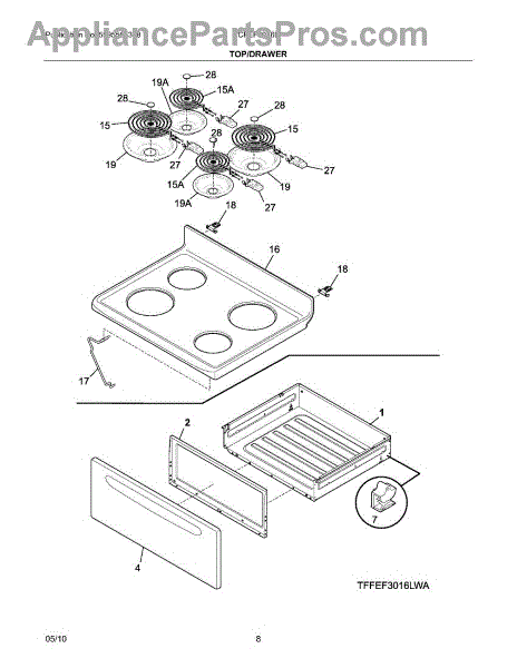 This is a Frigidaire main top for electric ranges. It sits beneath and holds the range's heating elements. If this part is damaged, it's usually obvious. It may dent or in some extreme cases, rust, and should be replaced if it's no longer able to hold heating elements.Before installing this part, make sure that power to the stove is cut, and do not begin repairs until the range is completely cool. A screwdriver, nut driver, and small dowel rod may be needed to install this part. Start by removing each heating element and drip pan. The old cooktop should be held in place with a number of screws or mounting brackets, the first of which may need to be accessed from inside the oven. Mounting hardware must be removed from the old cooktop and installed in the new one before putting the new cooktop in place.This is a genuine OEM part compatible with ranges from Frigidaire brands, including Electrolux, Frigidaire, Gibson, Kelvinator, Westinghouse, and others. This product includes no additional hardware.
