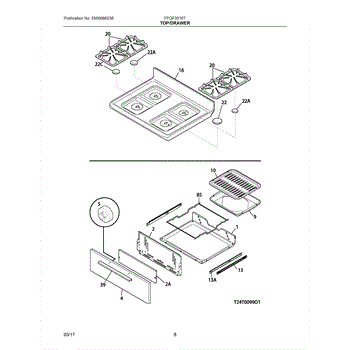 This main top is the upper cooktop panel that covers and protects the range's burners and internal components while providing a stable surface for cookware. It restores the cooktop's appearance and containment of spills. What it does: