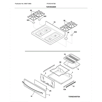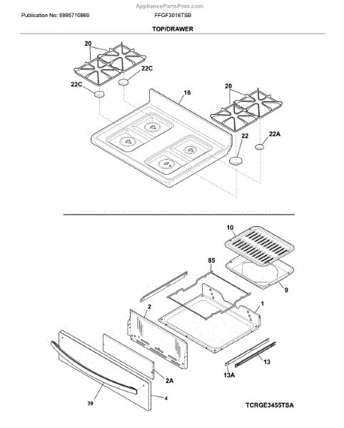This main top is the upper cooktop panel that covers and protects the range's burners and internal components while providing a stable surface for cookware. It restores the cooktop's appearance and containment of spills. What it does: