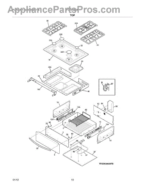 This main top assembly replaces the cooktop surface to restore a flat, secure mounting area for burners and controls. It helps improve appearance and prevents food and spills from entering the cabinet below. What it does: