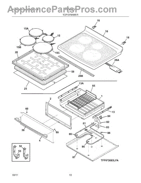 This main top assembly replaces the upper cooktop surface to restore a flat, finished work area and secure the burners and controls. It improves appearance and helps ensure proper fit of grates, burners, and control components. What it does: